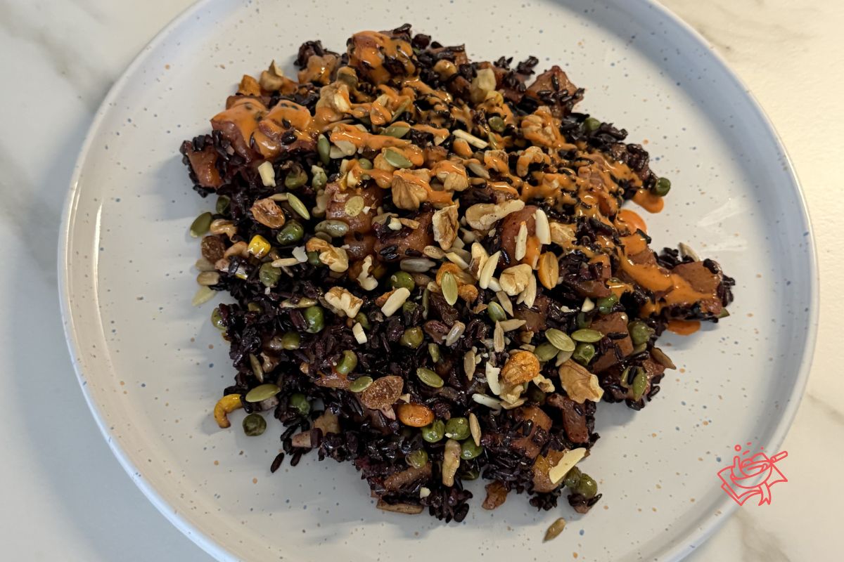 Hay combinaciones que suenan raras… hasta que las pruebas. Este arroz con piña (sea negro o normal de toda la vida) juega a lo grande: salado + dulce, cremoso + crujiente, y ese final con sriracha mayo y cítrico rallado que te deja diciendo “otra cucharada y ya”. Spoiler: nunca es solo una.